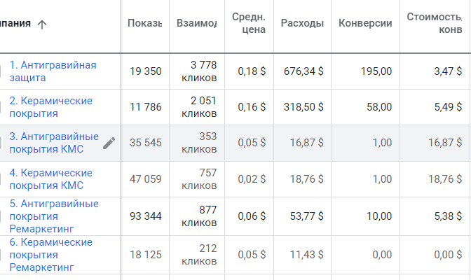 Кампании КМС и ремаркетинг керамических покрытий результата не дали. Их приостановили, так как в рамках месячного рекламного бюджета получаем достаточное количество трафика из поисковых кампаний. Нет необходимости тратить бюджет на источники, которые изначально проявили себя неэффективно, даже для целей дальнейшей их оптимизации.