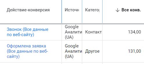 Также интересны данные по типу конверсий. Получили приблизительно равное значение звонков и отправленных форм с сайта.