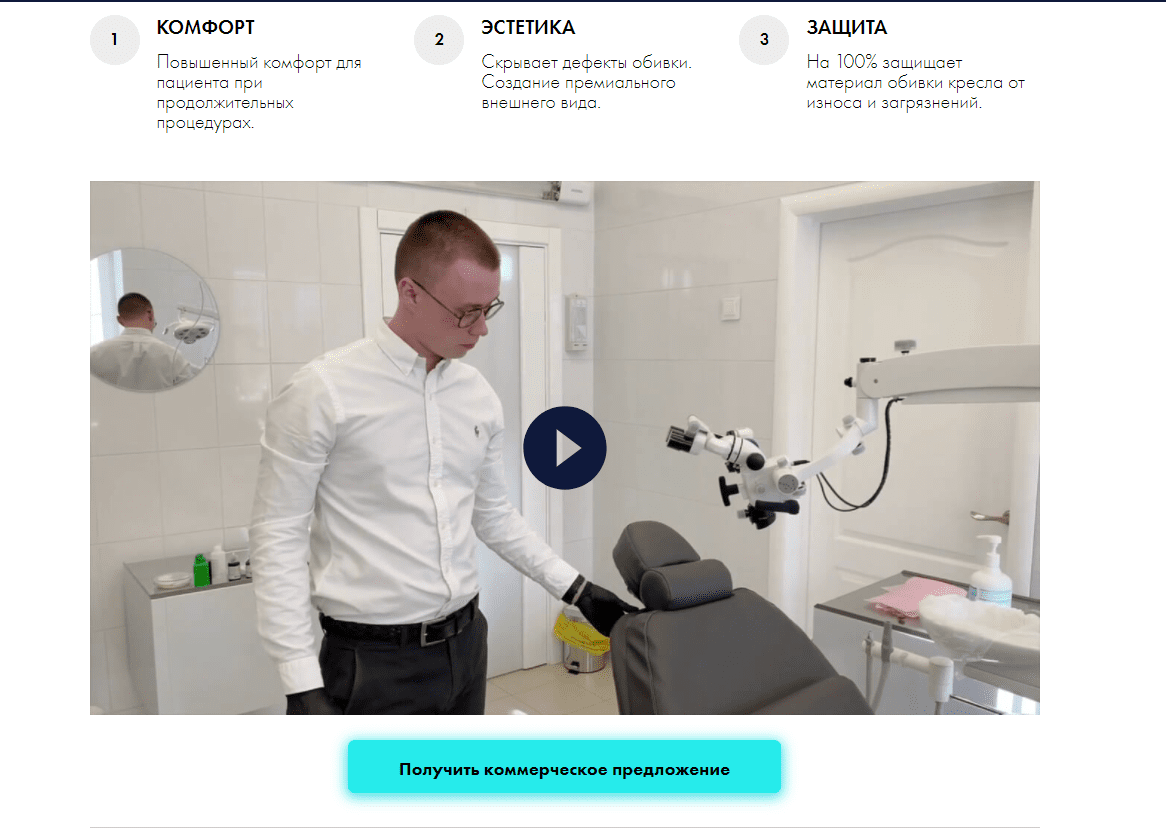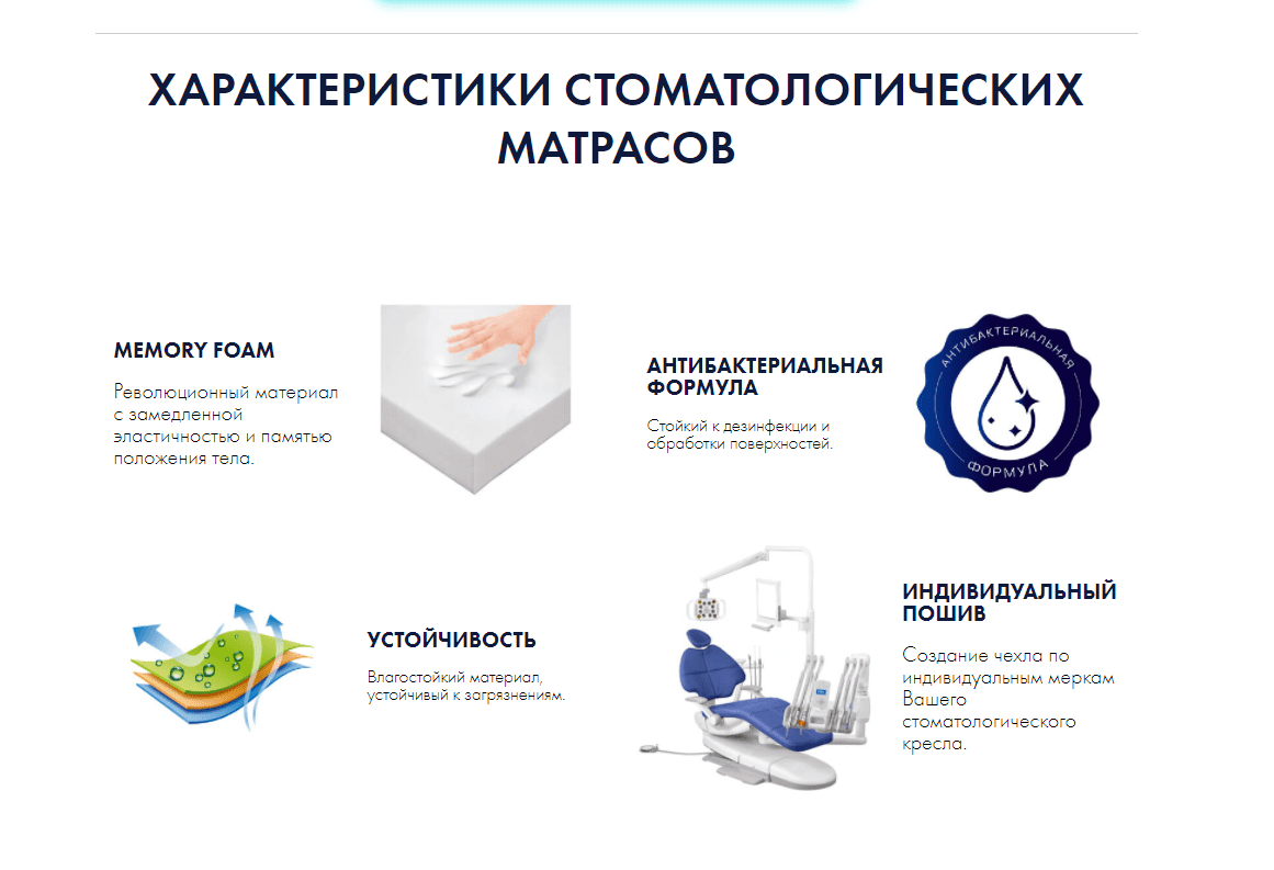 • Главная с оффером «Изготовим матрас по индивидуальному размеру для вашего стоматологического кресла»;