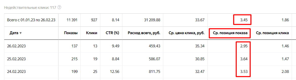 Например средняя позиция показов имеет значение 1,45. Это говорит о том, что ваше объявление в большинстве случаев показывалось на первой позиции.