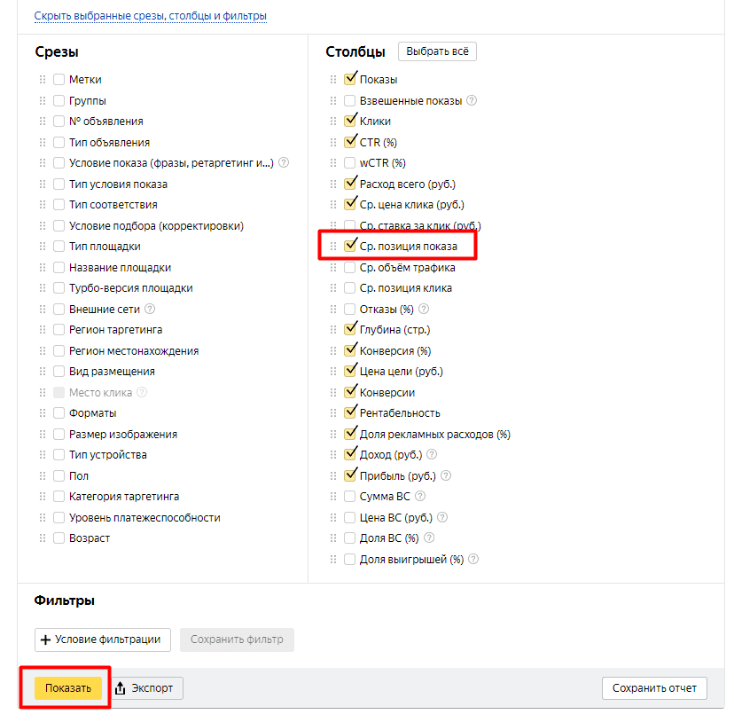 Для того что бы узнать значение средней позиции показов необходимо перейти в мастер отчетов Яндекс.Директ. Далее нажать «Показать выбранные срезы, столбцы и фильтры».